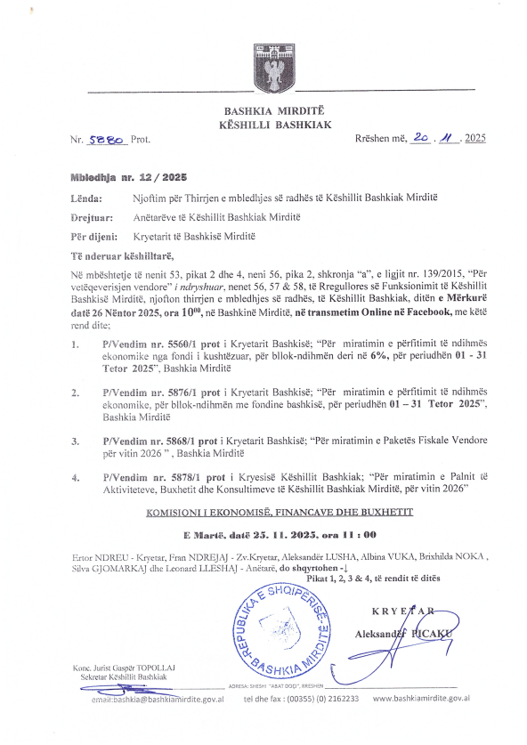 Ditën e Mërkurë , datë 26.11.2025, ora 10:00 në Bashkinë Mirditë , do të mbahet mbledhja e radhës së Këshillit Bashkiak Mirditë me rend dite si më poshtë: